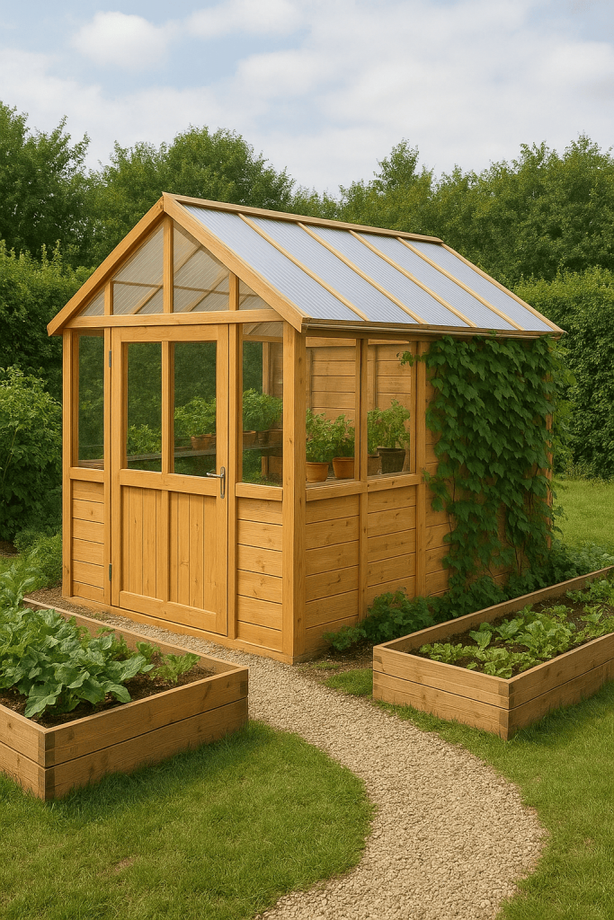 Здесь главный материал — дерево. Такие теплицы напоминают уютный домик, идеально вписываясь в природный, немного небрежный ландшафт.